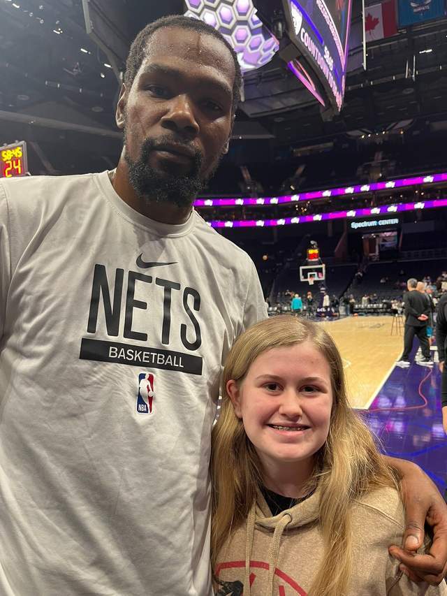 场边的小球迷看到KD笑了,也露出了灿烂笑容。