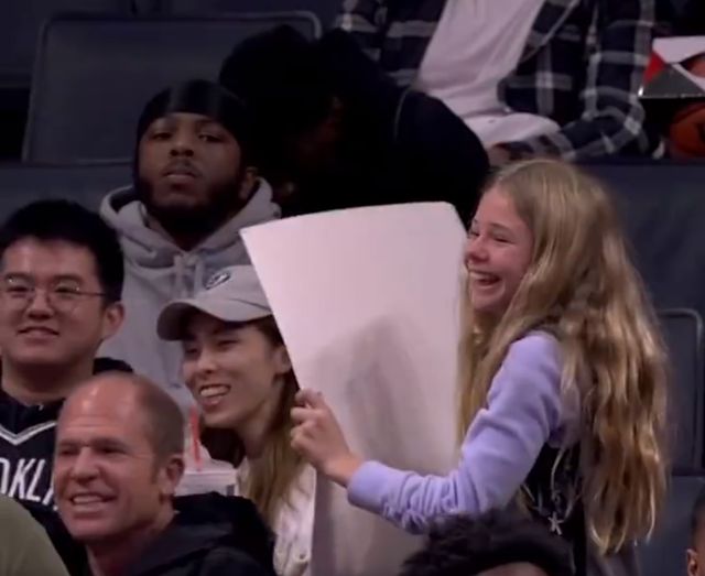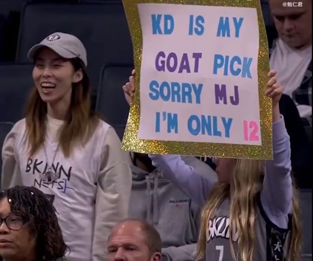 比赛进行期间,一位小球迷举牌表示杜兰特是她心中的GOAT:“我选杜兰特历史最佳,对不住乔丹,我才12岁!”
