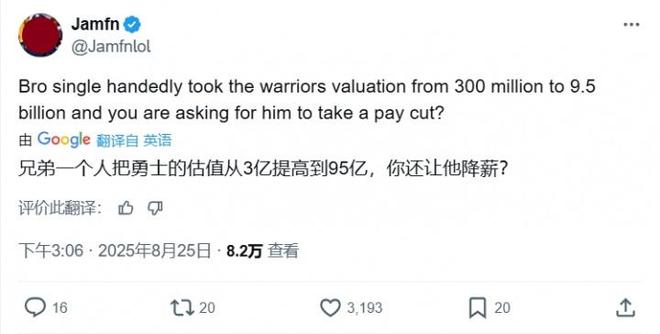 直播吧08月26日讯 据统计,勇士球星库里已经连续第9个赛季是联盟最高薪,具体是: 17-18: $3470万 18-19: $3750万 19-20: $4020万 20-21: $4300万 21-22: $4580万 22-23: $4800万 23-24: $5200万 24-25: $5570万 25-26: $5960万 网友Hub发问:“我好奇为什么从没人让库里降薪啊?哈哈哈……”引发了热烈讨论: