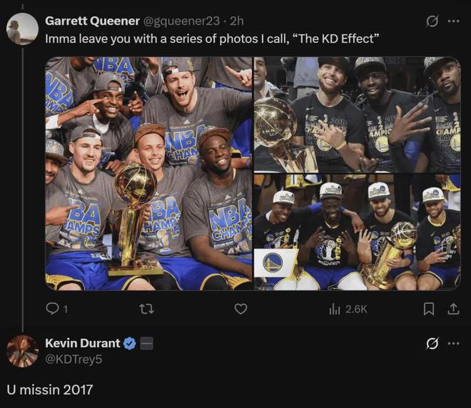 雷速体育8月26日讯 今日,网友发布一组杜兰特加盟勇士"前中后"期照片并配文:"杜兰特效应"。 杜兰特评论:“你漏了2017年的照片。” 随后有网友评论:“重点是:不论之前、期间还是之后,他们(勇士)根本就不需要你。” 杜兰特回复该评论:“重点是:我们都是冠军,为什么要这么生气呢?” 在2016-17赛季,杜兰特宣布加盟金州勇士,并随队拿到两个NBA总冠军,个人两连FMVP。但之后勇士球员追梦格林在与杜兰特的冲突中说出的那句“你来之前我们已经是冠军了!”,引发杜兰特离开勇士,随后辗转联盟。 |