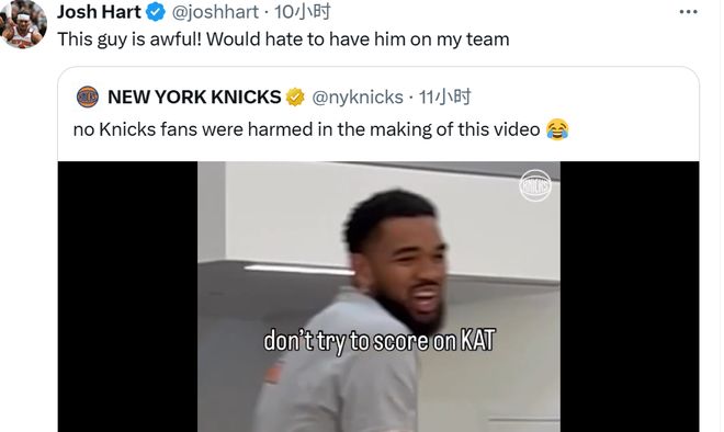 雷速体育8月22日讯 今日,尼克斯官方社交媒体晒出唐斯在训练营中花式扇飞小球员投篮的视频。 “本视频制作过程中,未对任何尼克斯队球迷造成伤害。”尼克斯官方社媒配文道。 哈特转发视频后调侃:“这哥们儿太烂了!我绝对不想和他成为队友。” |