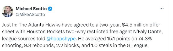 北京时间8月17日,据名记Scotto报道,消息人士透露,老鹰队将向受限制自由球员中锋恩法利-丹特提供一份2年450万美元的邀请合同。丹特的母队火箭队将有两天时间来匹配这份邀请合同。然而,据Spotrac的基思-史密斯称,火箭目前在第一土豪线硬工资帽下没有足够的空间来匹配丹特与老鹰达成的合同。
