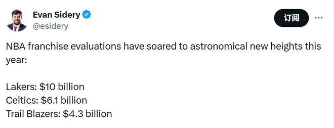在这期间的三年里,NBA球队的价格飙升。2023年,菲尼克斯太阳队以40亿美元的估值售出,创下当时NBA球队的纪录。今年春天,波士顿凯尔特人队的大股东怀克-格罗斯贝克同意将球队出售给比尔-奇泽姆牵头的一个财团,初步估值为61亿美元。这笔交易已经获得董事会批准。随后,巴斯家族原则上同意将洛杉矶湖人队出售给金融家马克-沃尔特,这笔交易对湖人队的估值达到了创全球纪录的100亿美元。