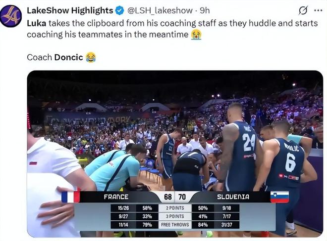 在斯洛文尼亚70-68领先法国的暂停期间,斯洛文尼亚的教练组正在探讨什么,此时,东契奇一把从主帅手中接过战术板,随后他让球员们过来开始画战术、讲解战术,留下一脸懵的几位教练。这一方面说明东契奇的话语权,另一方面也说明东契奇的球队话语权之大。 有球迷打趣说,新赛季的湖人队,雷迪克恐怕也要准备好迎接这样的待遇了,到时候,或许东契奇也要替雷迪克画一画战术了。 另外,比赛终场前也发生了争议一幕,东契奇与弗朗西斯科握手拥抱后,弗朗西斯科在比赛终场前还上了一个空篮,随后两队爆发冲突。这样的场面,更让比赛充满了话题性。