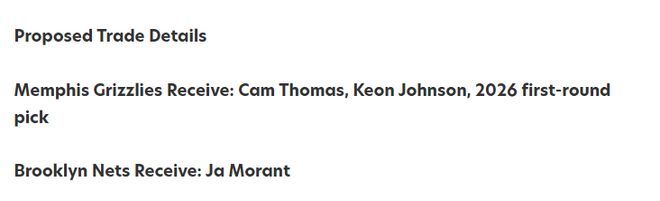 对此,美媒列出一组3换1交易方案,具体为:灰熊得到卡姆托马斯(先签后换)+吉翁约翰逊+26年首轮签,篮网得到莫兰特。首先,篮网一整个夏天几乎没什么动静,他们在死盯勇士,随时准备截胡库明加!卡姆托马斯和库明加处境非常相似,篮网提供一份1年599万资质报价,同时还给了他一份2年2800万(带球队选项)的合同,要么资质报价,要么接受带球队选项条款,托马斯也很生气,寻求一份超过2500万均薪的合同。首先,这笔交易对于篮网来说,他们需要一位真正的全明星级别核心,他们有这个市场需求。