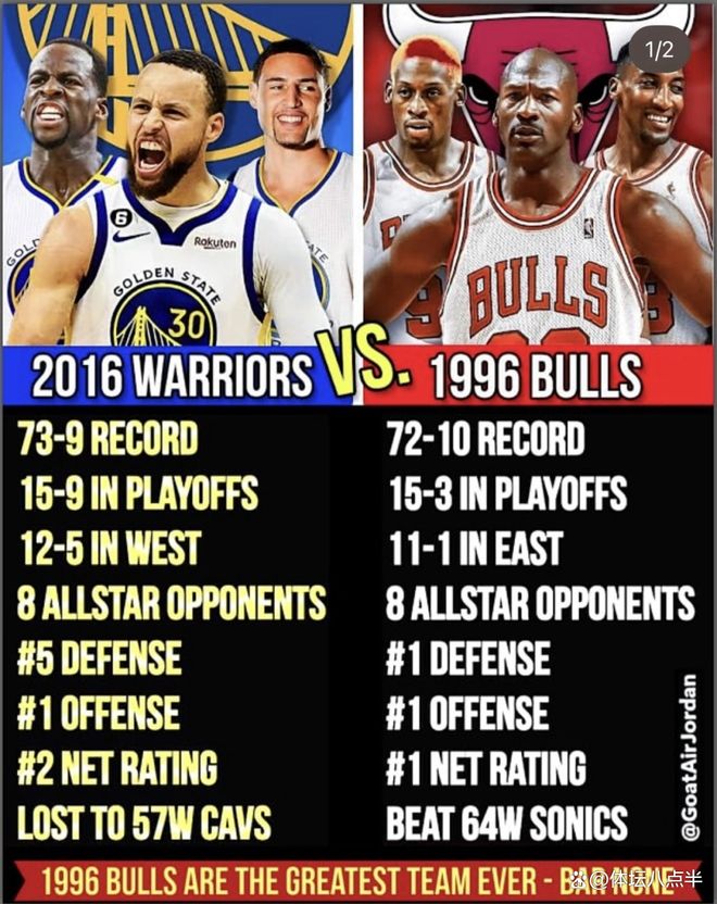 #优质图文扶持计划# 2016勇士和1996公牛都是历史顶级,但是谁更强,请听我分析,不对的话,欢迎您拍砖。 2016年勇士队 vs. 1996年公牛队 2016 年金州勇士 常规赛:73胜9负 季后赛:15胜9负 西部赛区 12胜5负 8位全明星级对手 防守第5 进攻第1 净效率第2 主力阵容: 斯蒂芬·库里(PG), 克莱·汤普森(SG), 哈里森·巴恩斯(SF), 德雷蒙德·格林(PF), 安德鲁·博古特(C)