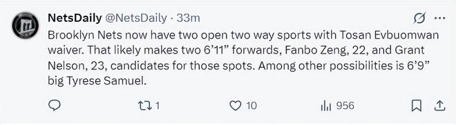 随后篮网队官方也致谢了厄沃马的贡献,如此一来篮网双向合同名单只剩下一人艾蒂安,换言之还有两个双向合同名额。