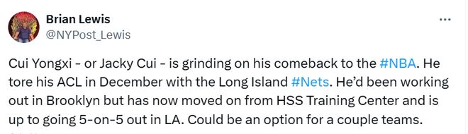 Lewis晒出崔永熙的训练视频,配文写道:“崔永熙正为重返NBA全力备战。去年12月,他效力于长岛篮网队(布鲁克林篮网队下属G联赛球队)期间遭遇前交叉韧带撕裂。” “此前,崔永熙一直在布鲁克林进行康复训练。现在他已经离开HSS训练中心,准备在洛杉矶参加5v5训练,他可能成为一些球队的选择。”