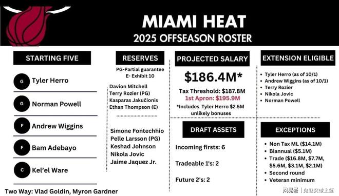据悉,这笔2换1交易还为迈阿密热火创造了一个价值560万美元的交易特例。如此一来,迈阿密热火目前就可以使用价值1410万美元的全额中产进行引援补强。显而易见,这应该就是热火亏本甩卖海史密斯的根本原因,因为他们迫切想要清理掉他下赛季的562万薪资合同,以便将球队下赛季的球员薪资总额控制在奢侈税线下,同时还要能使用全额中产。