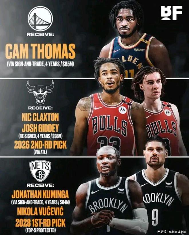 近日,美媒《Basketball Forever》围绕勇士、公牛、篮网相互解套模拟了一个三方交易方案。具体交易内容为: 金州勇士获得:卡梅隆托马斯(4年6500万先签后换); 芝加哥公牛获得:尼古拉斯克拉克斯顿+2026年次轮签(来自老鹰现属篮网)+约什吉迪(4年9800万续约); 布鲁克林篮网获得:乔纳森库明加(4年8400万先签后换)+尼古拉武切维奇+2028年公牛首轮签(前五保护)。