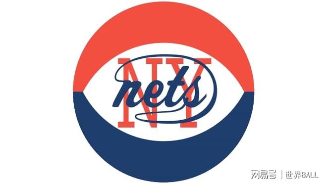 你对这些元素没有似曾相识的感觉?那么先重温一下锡拉丘茨民族队的队徽吧(点此前往:《有的人拿了MVP却……费城76人队徽演变史》)。之所以想到民族队的队徽,是因为发现两者队徽中象征美国国旗的元素都是不完整或者意义不明的,甚至国旗方向的横直都颠倒了,也没有人介意这一点。 关于这版队徽,有个细节不容易被察觉。如果你发现国旗两边的红白条颜色不那么纯正,那不是你的显示屏脏了,而是因为国旗并非处于一个绝对的平面中,从而营造出一种旗子在摆动的效果。基于这一点,我愿意给这版logo以高分。 1968-69~1971-72 高分版logo仅使用了一年便随着球队搬迁以及队名变更而退出历史。 新队徽放弃了盾牌造型,转而由简单的三部分组成。红色瘦长版的“NY”代表纽约,作为logo的最底图层;蓝色小写的队名“nets”首尾字母用夸张的连笔写法形成一个左侧开口的椭圆,挡在“NY”的前方;队徽右侧是个黑白色的球员,看起来正在运球前行;他的篮球遮住“nets”椭圆的右侧,作为logo的最上图层。