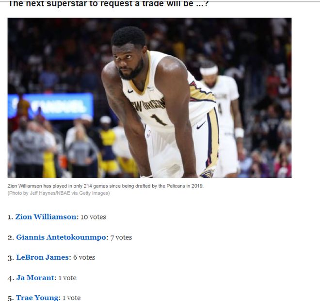 新赛季可能申请交易的球星预测: 1、锡安 10票 2、字母哥 7票 3、詹姆斯 6票 4、莫兰特 1票 5、特雷-杨 1票