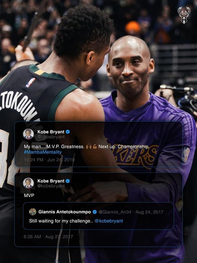 字母哥最终在2019年拿到了自己的第一个MVP,科比也发推祝贺:“我的兄弟……MVP!非常伟大!下一个挑战,总冠军!” 字母哥最终在2021年拿到了自己的首冠,赛后发布会他还谈到了科比:“曼巴精神对我来讲意义重大,他一开始回复我,我以为是个玩笑,但他说我的挑战是MVP,但是科比让我相信,我有成为MVP的潜力,那我必须去做到,我必须努力训练,我不能让他失望。” |