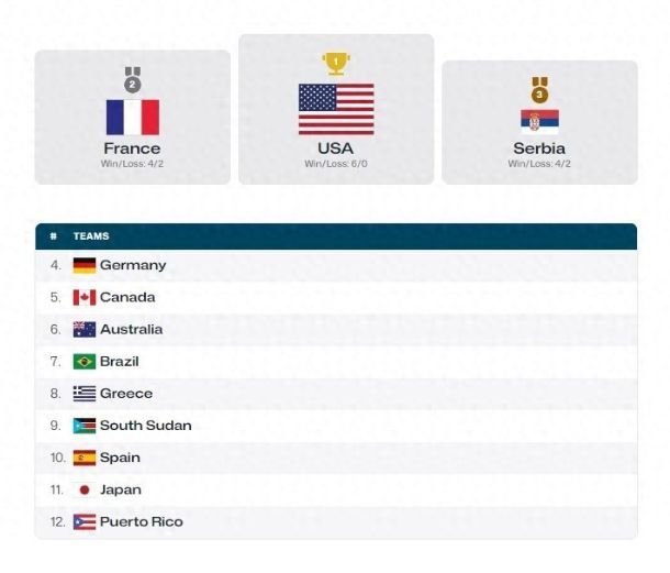 2024年巴黎奥运会男篮最终排名: 1、美国 2、法国 3、塞尔维亚 4、德国 5、加拿大 6、澳大利亚 7、巴西 8、希腊 9、南苏丹 10、西班牙 11、日本 12、波多黎各 (文/醉卧浮生) |