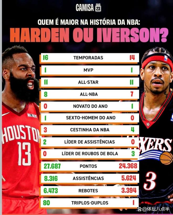 综合评价 看重“长期稳定+团队增益+可量化产出”:哈登更优。 看重“巅峰记忆度+逆时代难度+文化符号”:艾弗森更高。 综合偏向哈登。