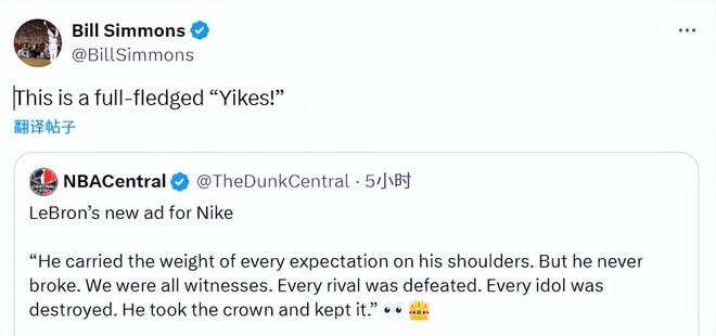 名嘴比尔-西蒙斯吐槽这条广告太尴尬:“这是一个真正的‘哎呀’!”詹姆斯面临着不少批评声,很多球迷的观点与西蒙斯一致—— “我的天,这条广告的调性和当年《决定》(注:指2010年詹姆斯通过电视节目宣布加盟热火的事件,当时引发巨大争议)一样让人不适。” “勇士和马刺都曾建立过王朝,他怎么能说击败了所有对手呢?” “我喜欢勒布朗,但这则广告对我来说也太过了。”