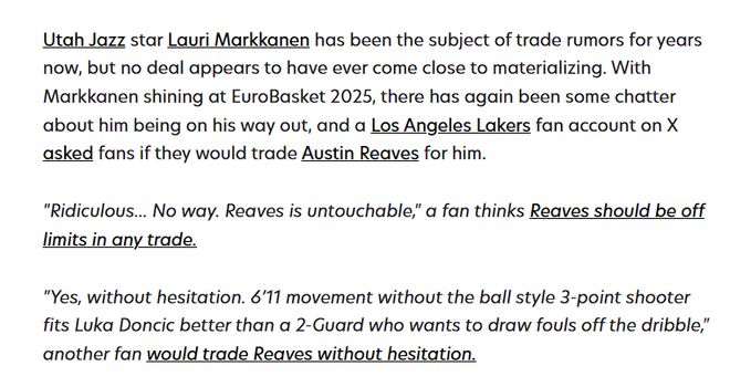 这名记者补充道,马尔卡宁在下赛季的年薪很高,小里夫斯的年薪无法匹配,这意味着湖人队要送出多名即战力球员,八村垒、文森特、克莱伯、范德比尔特等球员都将是可能的筹码。爵士队可能愿意接受文森特、克莱伯,毕竟他们与湖人的合同还剩下最后一年;但范德比尔特的合同还剩下两年,以及拥有球员选项,当下他在市场上并不受到追捧。 当然了,湖人队很可能不愿意送走八村垒。因此,这笔交易想要达成难度不小,加上马尔卡宁在24~25赛季的发挥一般,场均也才得到19分、5.9篮板、1.5助攻,更投出了职业生涯最差的42.3%的投篮命中率;但他在上赛季之前的赛季打出了职业生涯的巅峰表现,并且在欧洲杯的发挥相当出色。如果能够联手东契奇,湖人队的篮板球保护能力变强,整体进攻将会非常恐怖。