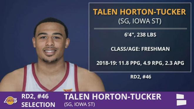 奥兰多魔术在第46顺位选择了霍顿-塔克,心仪他已久的湖人用现金和2020年的次轮签从魔术手中换回了他。 在生涯前两年,湖人都十分看中他,没办法他的静态天赋实在太变态了。 身高只有1米93,臂展却达到恐怖的2米16,身高臂展差高达23厘米,在整个NBA仅次于身高2米13、臂展2米39的班巴。 霍顿-塔克的身体很强壮,运动能力出色,疯狂的臂展让他拥有不错的篮板争抢和篮下终结能力,他还能控球传球,防守表现在一双长臂的衬托下显得潜力十足。 虽然他的投篮表现一直不够理想,湖人仍将他视为不可多得的珍宝。