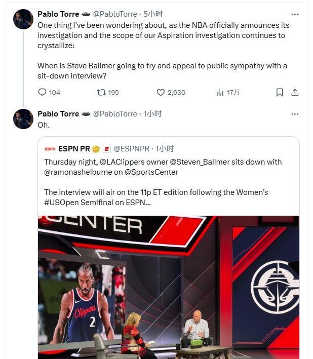 直播吧9月5日讯 The Athletic记者、前ESPN撰稿人Pablo Torre在播客节目中爆料,快船球星科怀-莱昂纳德(小卡)和老板鲍尔默之间存在规避NBA工资帽的阴阳合同,这一消息在网上引发了热议。 北京时间今早,快船老板鲍尔默现身ESPN节目《SportsCenter》,和知名女记者Ramona Shelburne进行对话。 值得一提的是,在节目开始前Pablo Torre曾发推预测:“随着NBA正式宣布调查,以及我们对Aspiration(涉事公司)调查范围的不断明晰,我一直在思考一件事:鲍尔默什么时候才能通过一次面对面的采访,来博取公众的同情?”
