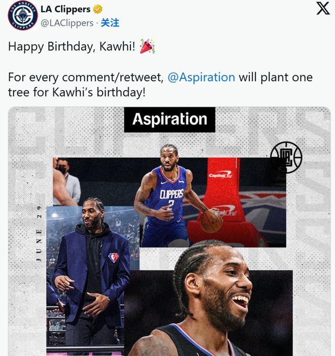 伦纳德。 “不用代言”的代言人 事情的逻辑很简单,甚至简单得有些过于直白。 今年3月,一家碳中和公司Aspiration申请破产,随后公司债权人的名单被公布,其中一家名为KL2 Aspire的公司被欠款700万美元,而这家公司正是伦纳德创办的。 欠款原因是Aspiration公司在2022年与伦纳德签订了一份4年价值2800万美元的代言合同,但奇怪的是,伦纳德从未在任何场合为该公司做过宣传,二者唯一的联系是快船队官方在2023年6月30日与Aspiration公司有过联动,祝贺伦纳德生日快乐,但伦纳德既没有点赞也没有转发。 拿了钱不营业,此事定有蹊跷。 于是在帕布罗·西松·托雷的报道中,一位财务部门主管表示,自己并不理解为何要给伦纳德这份合同,他得到的答复是:“有问题也别问,这是为了规避工资帽。” 经过帕布罗·西松·托雷的调查发现,Aspiration此前获得了由鲍尔默提供的5000万美元资金支持。而这份代言合同里包含一项条款,规定如果伦纳德离开快船队,Aspiration与KL2 Aspire之间的合同将失效,除此之外,伦纳德还可以“拒绝执行Aspiration要求的任何行动”,并继续获得报酬。