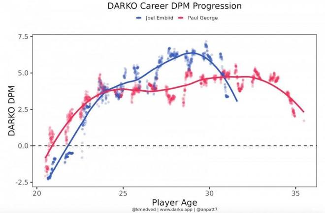 横轴为年龄,纵轴为量化后的表现;蓝色代表恩比德,红色代表乔治 这张图显示了恩比德和乔治职业生涯的正负值轨迹。如果目前的趋势继续下去,76人将完全被这种“为球员过往表现买单”的合同套牢。这对所有体育项目的管理层来说都是一个大忌。乔治上赛季只打了41场比赛,恩比德只打了19场,而且球队彻底崩溃,战绩跌至“相信过程”那些年的24胜58负。现在76人被两份他们可能希望自己没有给出的巨额合同所困,而快船则显得很精明。乔治的这出连续剧体现了联盟在第二土豪线时代正在发生的变化。 那么,76人的故事对NBA的未来意味着什么?有三件事正在同时发生。