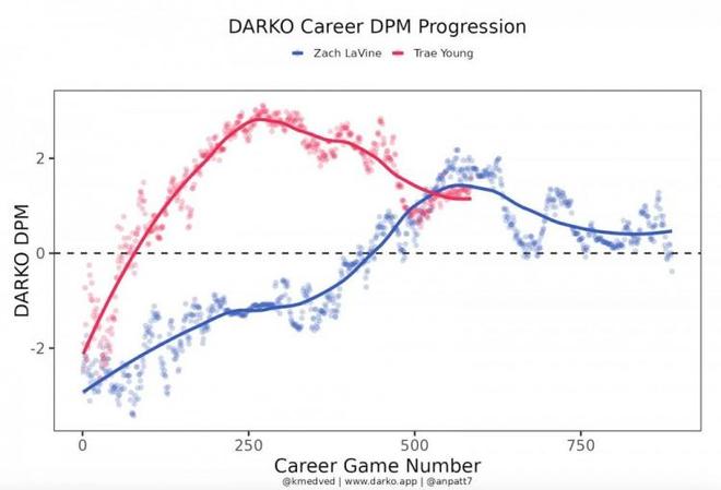 对联盟中的许多大牌球星来说,综合来看,这些因素共同导致了“NBA情境式关系”的兴起。球星的两到三年合同越来越受欢迎。就在今年夏天,凯里-欧文、弗雷德-范弗里特、詹姆斯-哈登和朱利叶斯-兰德尔都签下了相对短期的“情境式”合同。就连联盟的门面勒布朗,也发现自己处于一种情境式关系中。坦率地说,这让双方都处境尴尬。双方都心猿意马。 明年,可能就轮到特雷-杨和扎克-拉文面对情境式合同条款了。这两名球员都有全明星履历,但目前尚不清楚这两位球星究竟能在多大程度上影响比赛的胜利。他们的曲线看起来不太妙: