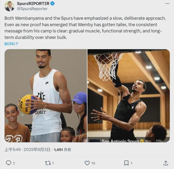 北京时间9月3日,马刺随队记者Dusty Garza撰文,披露了文班亚马今年休赛期的几方面提升:稳步增加肌肉和体重,尤其是核心力量和下肢力量。马刺希望文班亚马的生涯能像贾巴尔那样长(20个赛季),并不急于让他快速增重。