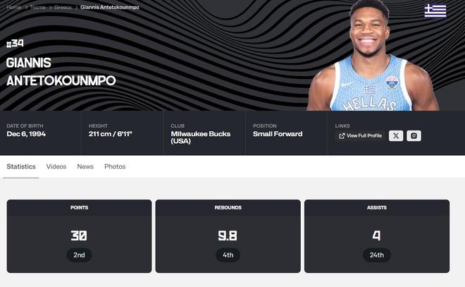 攻防两端统治力拉满 与斯洛文尼亚的东契奇一样,字母哥也是希腊队的绝对核心,并且比赛影响力更加恐怖。 哪怕三分投射威胁有限,字母哥在国际舞台上依旧统治力十足,全场出战29分钟,23投18中,以夸张的个人效率爆砍全场最高的37分,外加10篮板1助攻1盖帽。 并且与相对依赖罚球的东契奇不同,字母哥几乎所有得分都来自于直接的终结进球而不是罚球,本场比赛字母哥仅获得两次罚球。