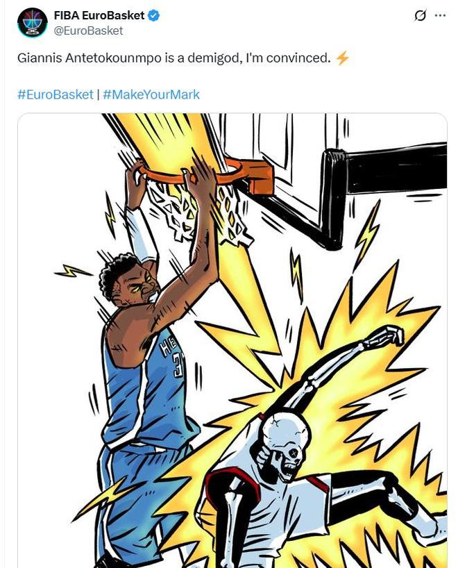 官方直呼半人半神 字母哥如此夸张的表现也直接征服欧锦赛官方,后者在希腊晋级八强后公开晒出了字母哥手绘风格的隔扣图片,并且配文:“字母哥半人半神,我坚信这一点。”
