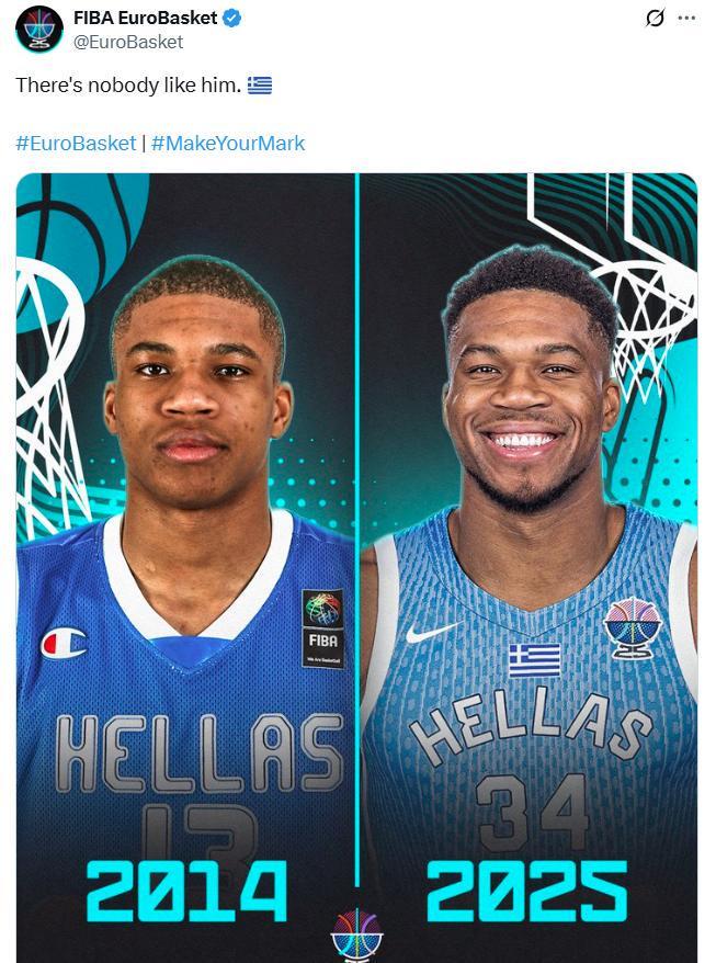 接着FIBA欧锦赛官方又晒出字母哥14年和25年代表国家队征战的对比图,夸赞到:“没人能像他一样!”