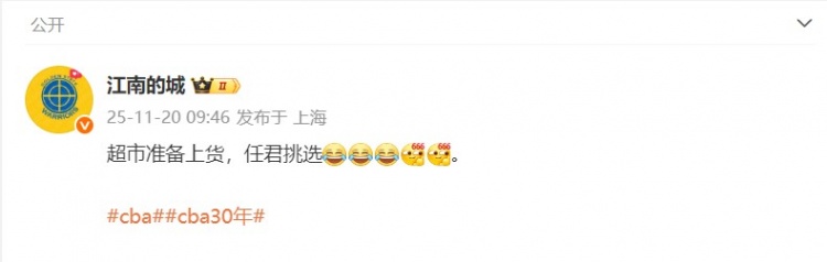 足球比分网11月20日讯 今天,媒体人@江南的城 疑似在社媒上谈到了四川男篮。 @江南的城 先是在社媒发了一条动态,写道:“超市准备上货,任君挑选。”