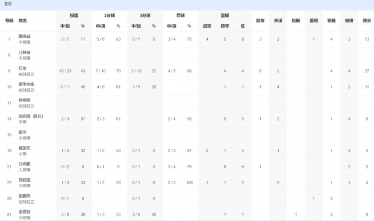 北京队方面,石奎27分4篮板6助攻,隰泰诚13分9篮板3助攻,偰李永炜11分1篮板1助攻。