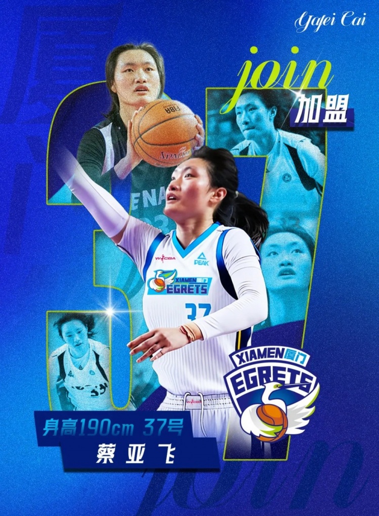 蔡亚飞 蔡亚飞出生于2001年,身高190cm,司职内线。她已在WCBA联赛征战多个赛季,曾先后效力于河南、陕西,积累了丰富的比赛经验。在23-24赛季,她场均能贡献8.4分和7.4篮板,展现了扎实的篮下技术和可靠的篮板能力。她的加盟,将进一步充实球队的内线轮转深度,为球队在攻防两端提供更多可能。欢迎蔡亚飞加入厦门白鹭女篮大家庭,期待她在新赛季的赛场上全力以赴,守护禁区,与球队一同成长奋进!