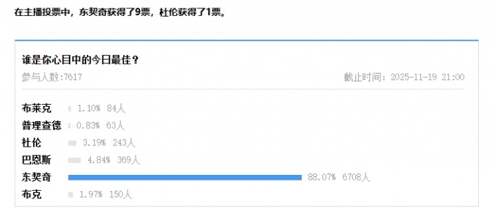 布克/太阳 127-110 开拓者 今日数据:出战29分钟,13投6中,19分6篮板5助攻3抢断。 在主播投票中,东契奇获得了9票,杜伦获得了1票。