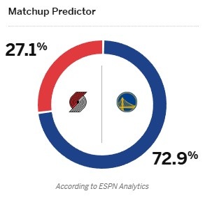 足球比分网11月21日讯 明天11:00NBA西部NBA杯C组,开拓者对阵勇士。 ESPN预测了本场比赛的胜率:勇士高达72.9%,开拓者仅为27.1%。