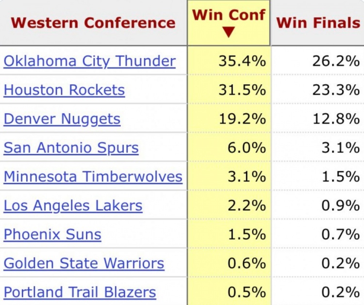 西部仅次雷霆!数据网:火箭西部冠军概率31.5