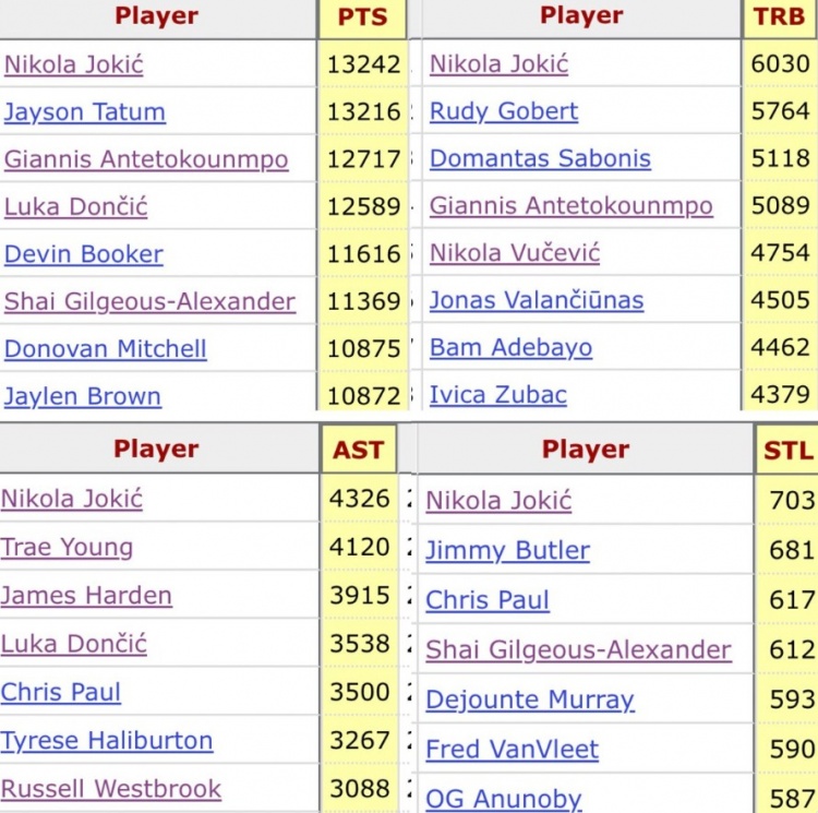 全能MVP!约基奇2020年代总得分/篮板/助攻/抢断皆