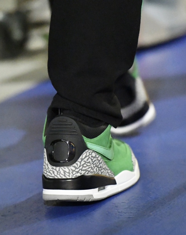 足球比分网11月22日讯 NBA杯小组赛,勇士主场迎战开拓者。 赛前,库里上脚经典俄勒冈配色的Air Jordan 3 PE球鞋。 库里现在可以自由选择在比赛中、热身时以及球员通道内穿着任何他喜欢的球鞋。他目前没有竞业禁止条款,可以立即与其他品牌签约。