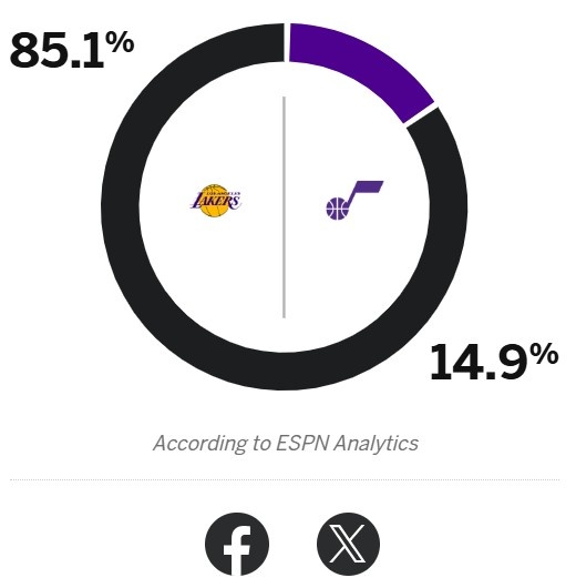 足球比分网11月23日讯 明天上午9点,湖人将在客场挑战爵士。 赛前,ESPN预测本场比赛胜率,湖人85.1%占据大优势,爵士14.9%。