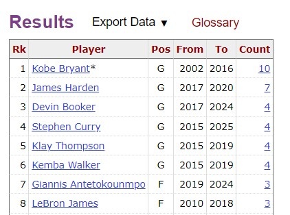 96-97赛季至今至少3次半场35+球员:科比10次 哈登