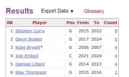 96-97赛季至今至少3次单节25+球员:库里8次居首
