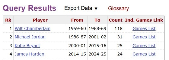 哈登生涯25次轰50+追平科比并列历史第三 仅次于