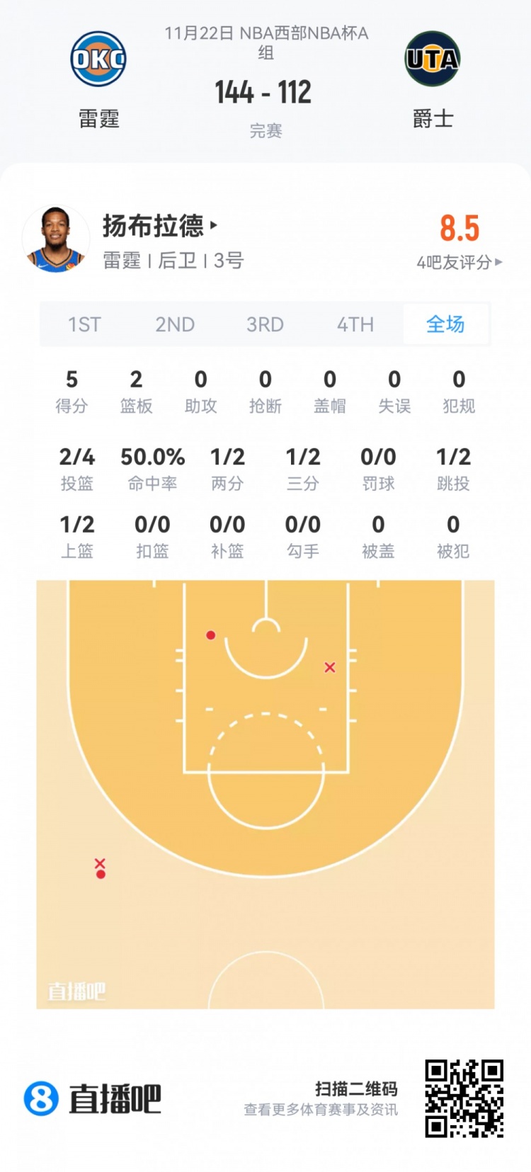 雷霆落选秀克里斯·扬布拉德 登场4.8分钟