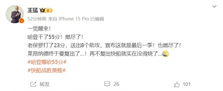 足球比分网11月23日讯 NBA常规赛,快船客场131比116击败黄蜂。赛后篮球评论员王猛在社媒上点评了这场对决。 王猛在个人微博上写道:“一觉醒来! “哈登干了55分!燃尽了! “老保罗打了23分,送出8个助攻,宣布这就是最后一季!也燃尽了! “莱昂纳德终于要复出了…!再不复出快船就实在没得烧了…” 本场比赛,哈登出战35分钟,26中17,三分16中10得到55分3板7助攻1抢断。保罗替补出战23分钟,5中1,三分3中1,罚球1中0拿到3分4篮板8助攻。