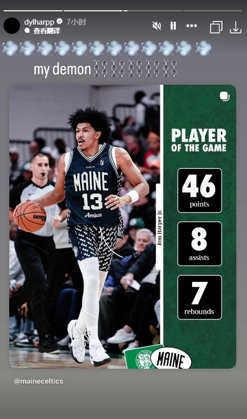 足球比分网11月22日讯 NBA G联盟开季锦标赛,缅因凯尔特人113-111击败特拉华蓝衫。 凯尔特人双向球员小罗恩·哈珀本场比赛状态全开,26投16中,三分14中7,罚球7中4,砍下46分7篮板8助攻1盖帽。 马刺榜眼迪伦·哈珀赛后转发哥哥数据配文:“我的恶魔。”