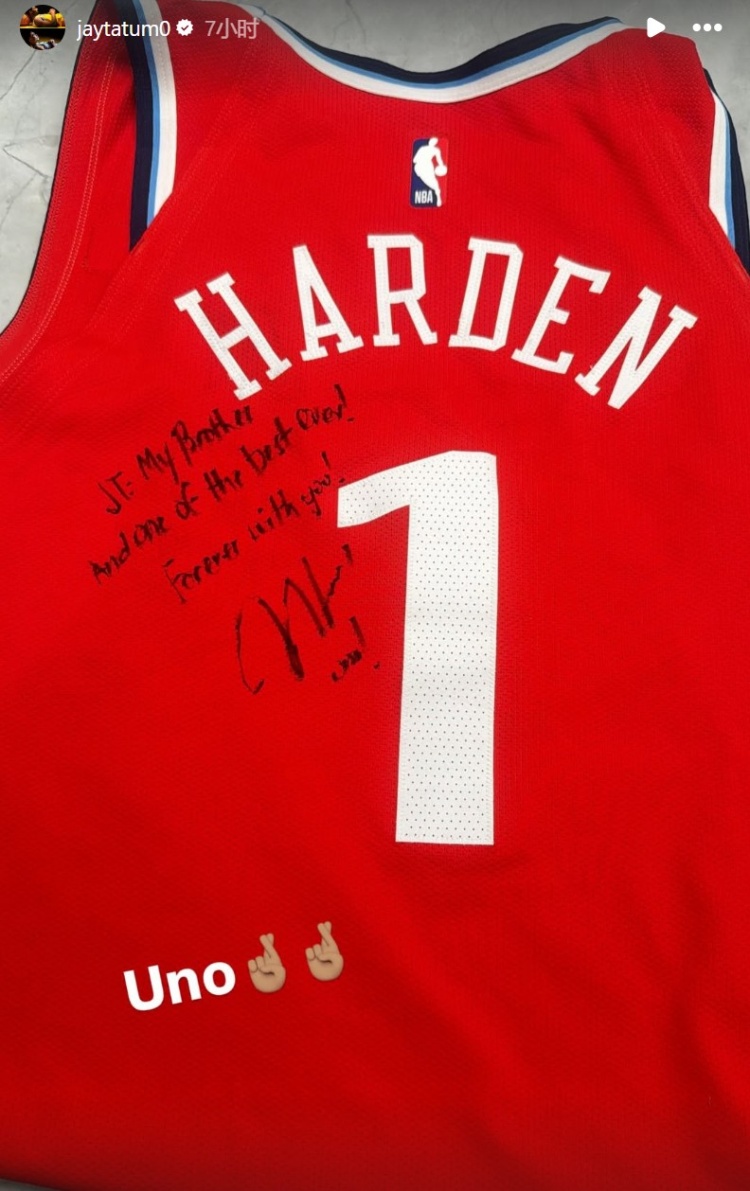 塔图姆晒哈登亲签球衣:致我的兄弟 世界上最佳