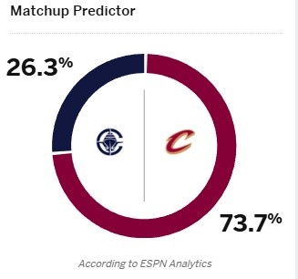 足球比分网11月23日讯 明天07:00NBA常规赛,快船客场挑战骑士。 ESPN给出胜率预测,快船仅为26.3%,骑士为73.7%。