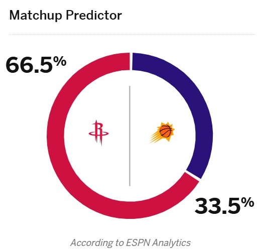足球比分网11月24日讯 明天上午10点30,火箭将在客场挑战太阳。 今天,ESPN预测本场比赛胜率,火箭66.5%占优势,太阳33.5%。