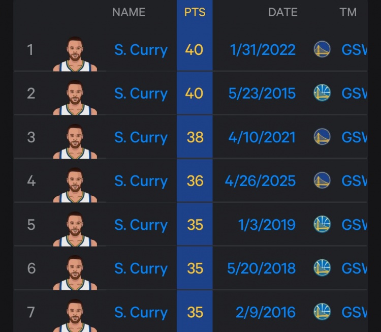 足球比分网11月27日讯 NBA杯赛,勇士将对阵火箭。 赛前勇士媒体WarriorsMuse晒出数据显示,库里生涯打火箭的最高分是40分。而他在对阵联盟其他25支不同球队时,至少都有一次单场得分超过40分。