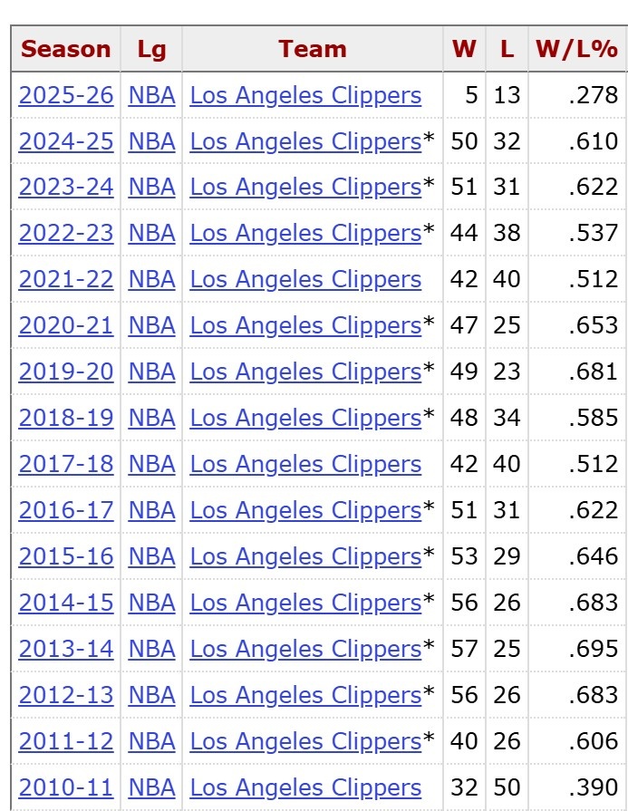 已连续14年胜率超五成!快船目前胜率仅27.8% 队史